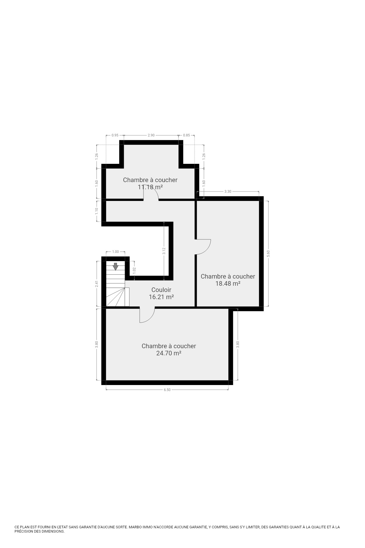 Premier étage : hall (16 m²) chambre 1 (25 m²) chambre 2 (18 m²) chambre 3 (11 m²)