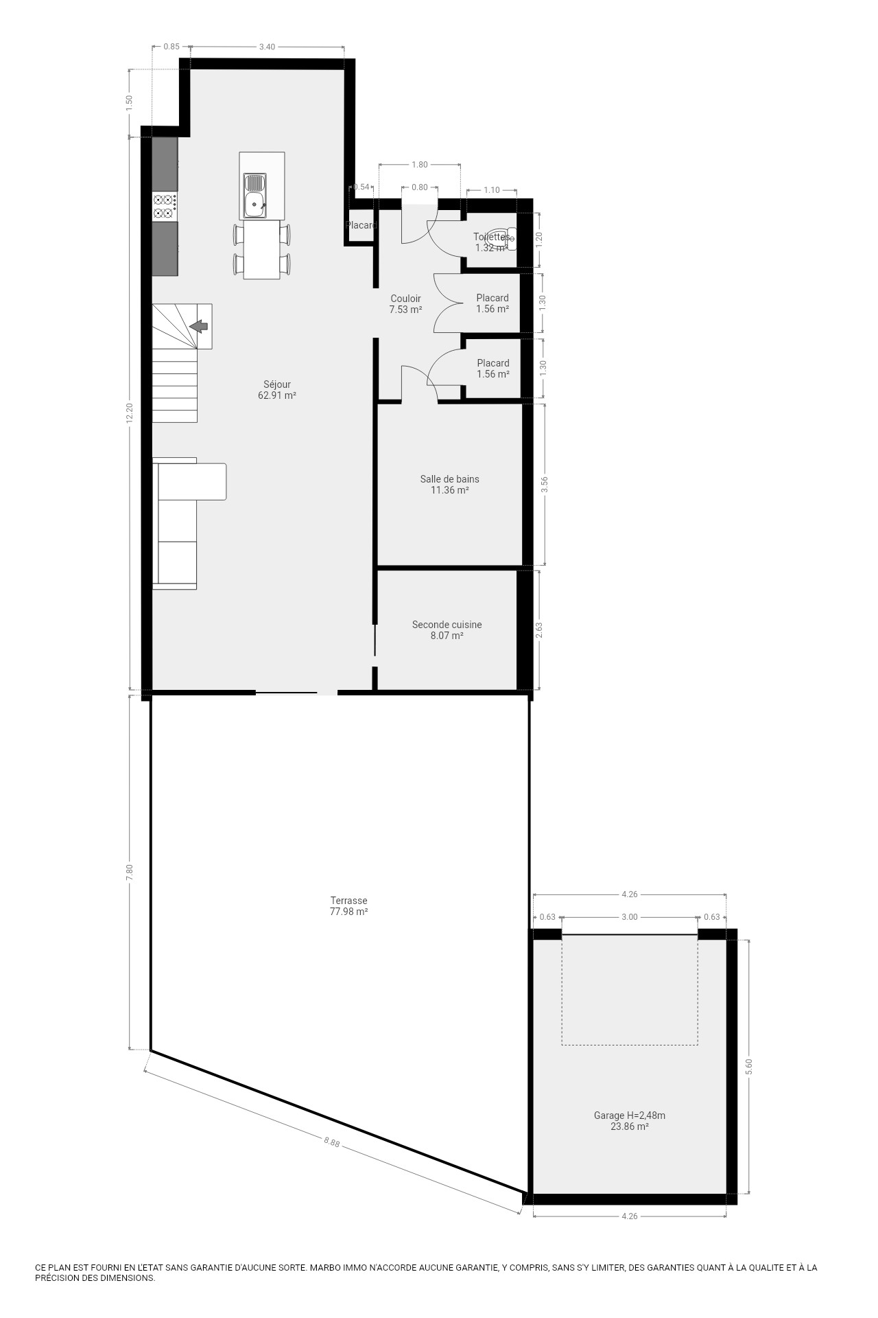 Rez-de-chaussée : hall (8 m²) - salle de bain (11 m²) - vaste pièce de vie ouverte avec cuisine, salon et salle à manger (63 m²), avec accès direct à la terrasse (78 m²) - buanderie / cuisine secondaire (8 m²)