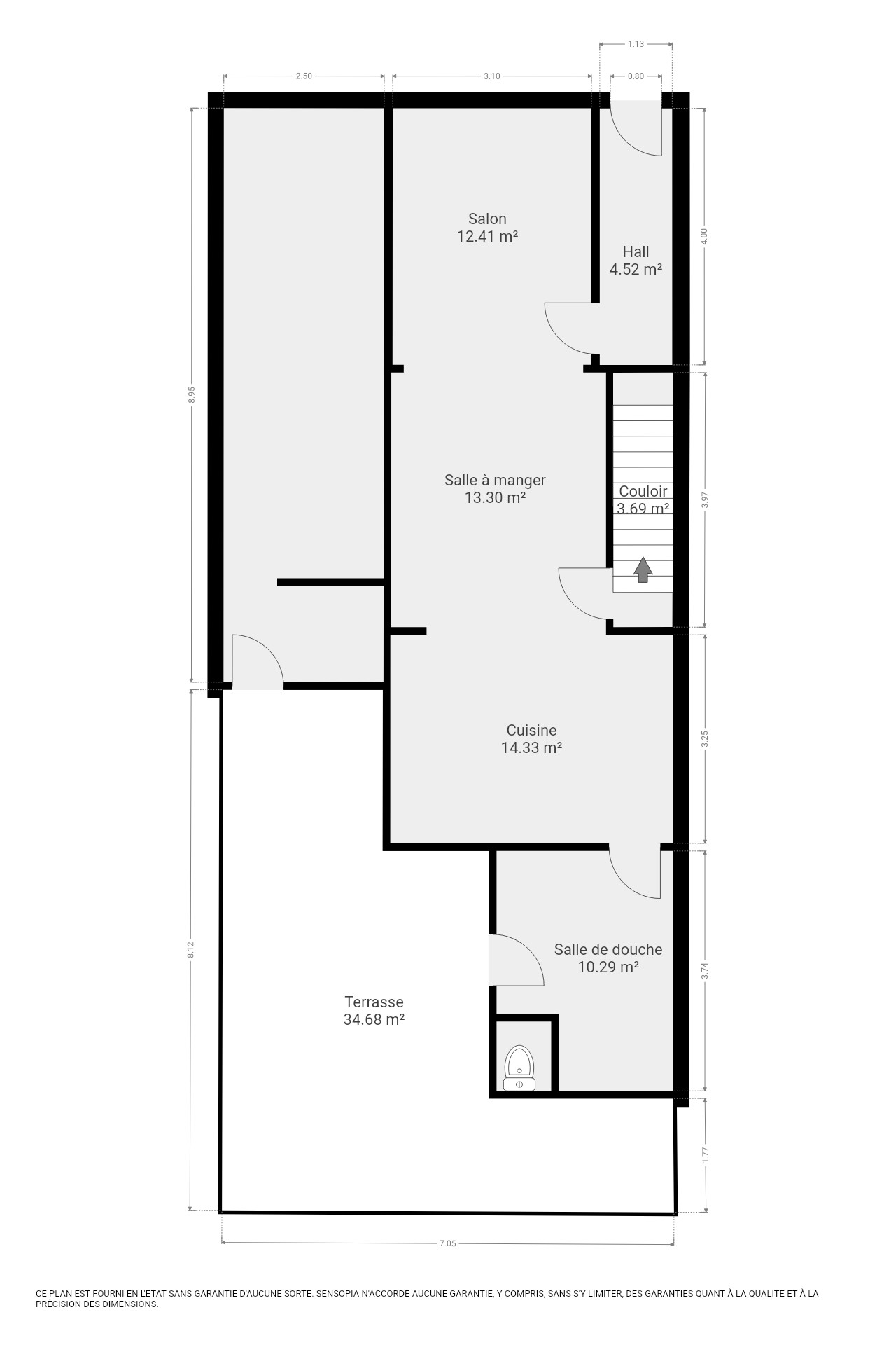 Rez-de-chaussée : Salon (12,41m²)  - Salle à manger (13,30m²) - Cuisine ouverte (14,33m²) - Salle de douche (10,29m²) - Terrasse (34,68m²) - Garage (22,25m²)