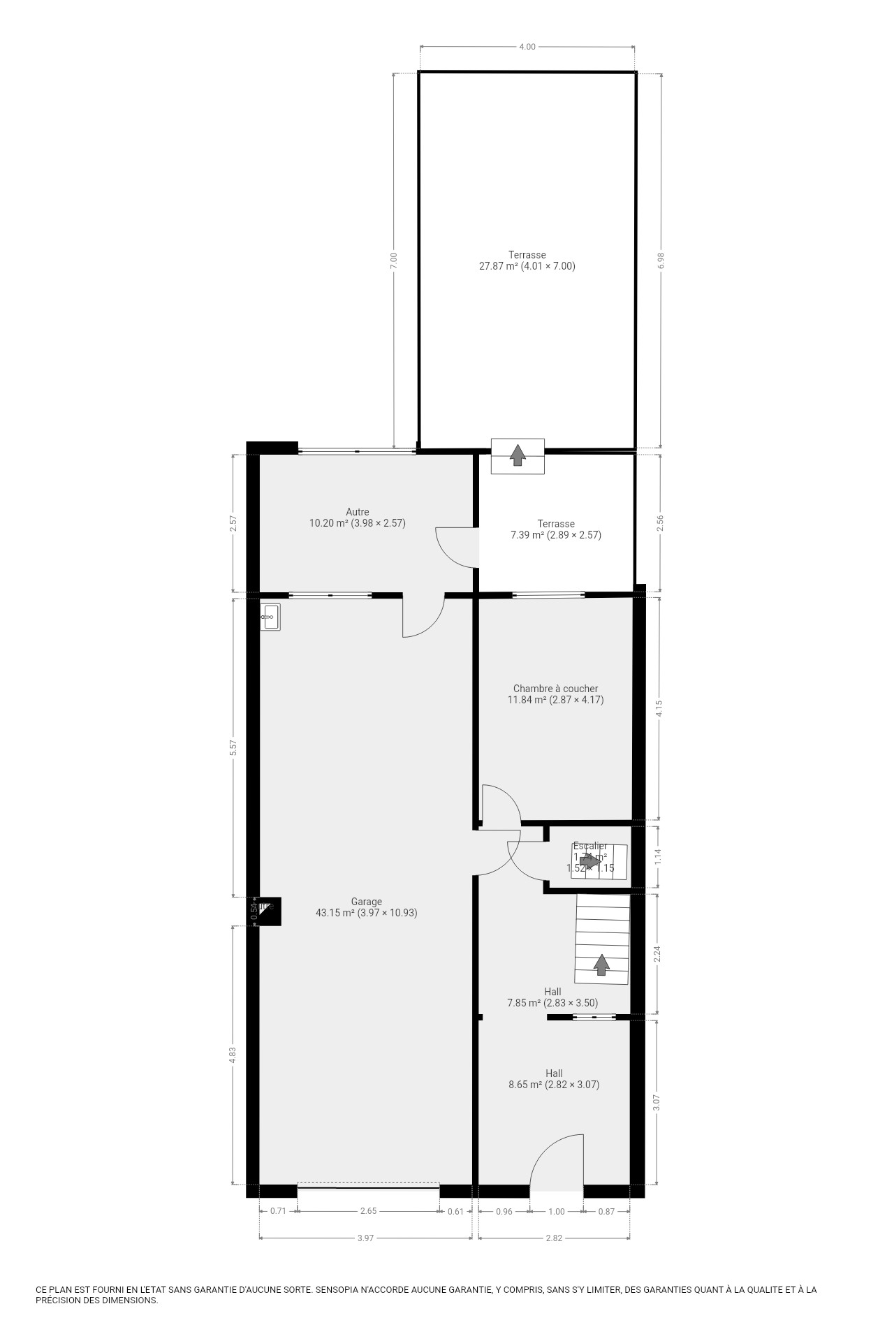 Rez-de-chaussée : Hall d'entrée (8,65 m²) - Chambre 1 (11,84 m²) - Garage (43,15 m²) - Buanderie (10,20 m²) - Terrasses (7,39 m² / 27,87 m²)